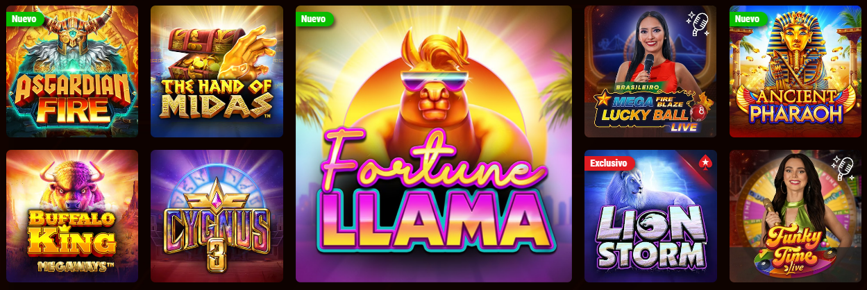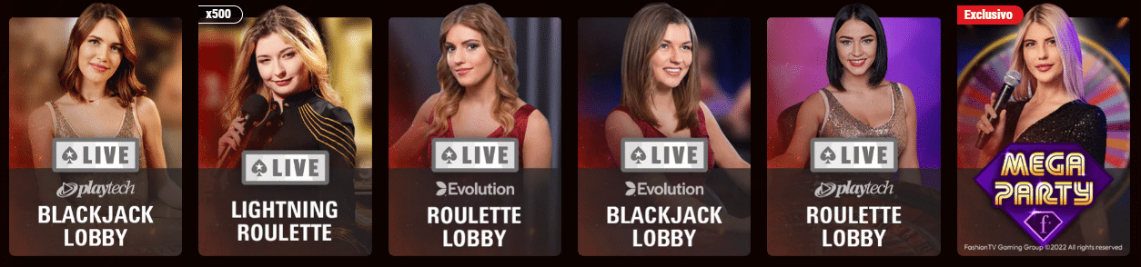 - Juegos en vivo: Ruleta, TV shows, barras de Poker-en-vivo, Ruletas con crupier, otros juegos de cartas en vivo, dados en directo, mesas de blackajack y baccarat live.