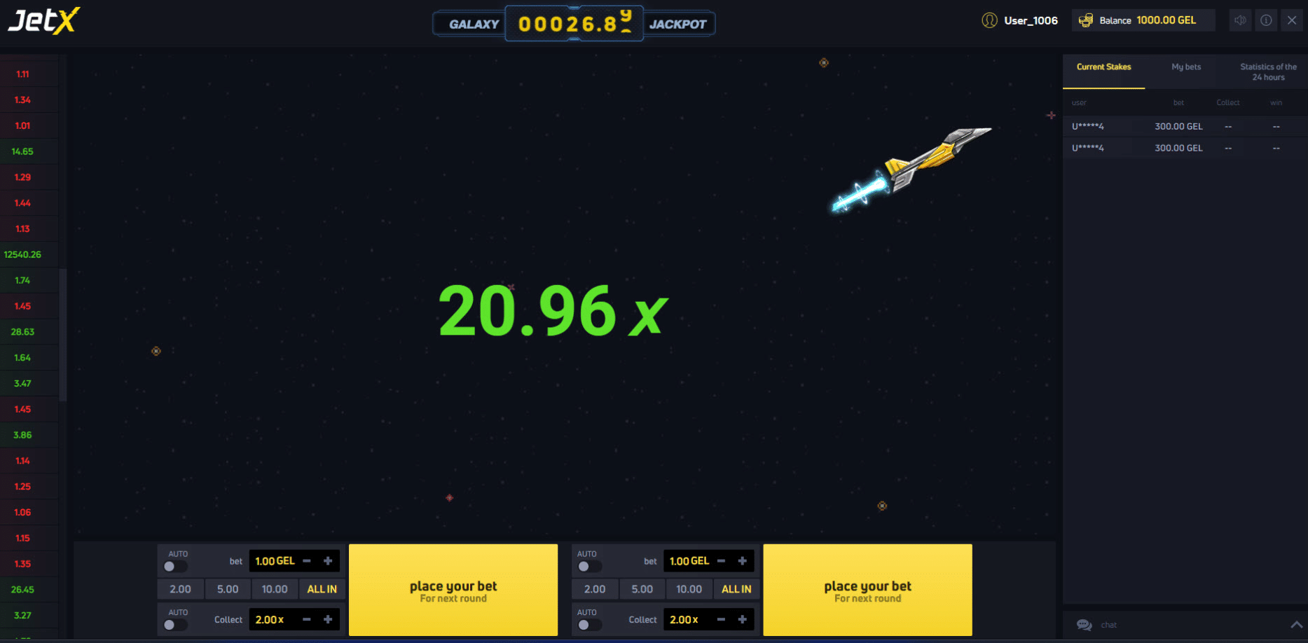 Del mismo modo, podrás hacer dos apuestas a la par con diferentes multiplicadores. Puedes elegir retirar la primera apuesta con un multiplicador bajo y la otra con un multiplicador más alto. Pero, si la aeronave colisiona antes de alcanzar el multiplicador establecido, perderás tu apuesta.